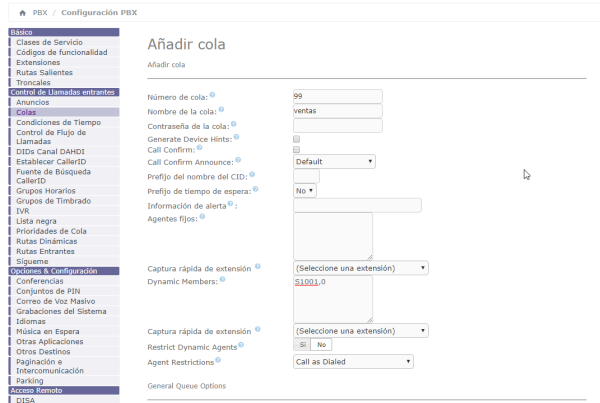 Le damos un número a la cola y un nombre, en la opción de Dynamic Members añadimos los agentes que hemos creado. Los agentes se añaden usando la siguiente syntaxis X,aaaa,b donde